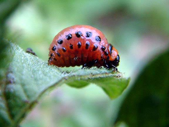 Lirfa colorado bjöllunar að troða sig út af